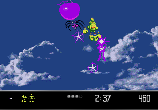 Gameplay: El objetivo del juego sigue siendo el mismo, llegar al final del nivel, avanzado lo más que puedas hacia la derecha, aunque hay 3 escenas que son diferentes. El juego no inicia como otro Side-Scroll, ya que al empezar caerás, solo el primer niveles, y tendrás que manejar a Vectorman mientras cae, esquivando obstáculos y enemigos, y recogiendo protones, los cuales puedes obtener de sacos o en el nivel, al recoger cierta cantidad, puedes obtener una vida y al obtener todos por un nivel, completas al 50% el niveles, el otro 50% lo obtienes al reventar todos los sacos que hay en un nivel, en el primer Vectorman, podías explotar televisiones que te daban up-grades, protones o vida, y tenían un poco de sentido, ya que el malo del juego trasmitía sus discursos en las teles, aqui es algo asi, ya que la Viuda Negra usa los sacos para sus crías. Como dije, si el juego hubiera salido en esta generación, hubiera sido DLC, ya que no hay una mejora sustancial en el modo de juego, lo único nuevo son unas transformaciones y 2 nuevas armas, al explotar los sacos, podrás encontrar las nuevas up-grades, las transformaciones son un pequeño tornado que destruye todo a su paso, esta es la única transformación que encuentras en sacos, ya que las demás son para ciertos niveles, el primero que ves es un submarino que no sirve para mucho, una nave espacial que se controla como la de Asteroids, estas 2 son para niveles bonus, la tercera y ultima se usa 3 veces para niveles completos, un tanque que invierte los controles, las armas nuevas de Vector son un rayo lazer que rebota en las paredes y otro que no, muy pobre el asunto, aunque algo totalmente nuevo es el poder absorber ciertos enemigos y obtener su habilidad, esta un búho raro que te de un escudo de invencibilidad, un rinoceronte que te da una tremenda fuerza y un cuerno y por ultimo esta un escorpión que te da una cola, inmunidad al fuego y ya.